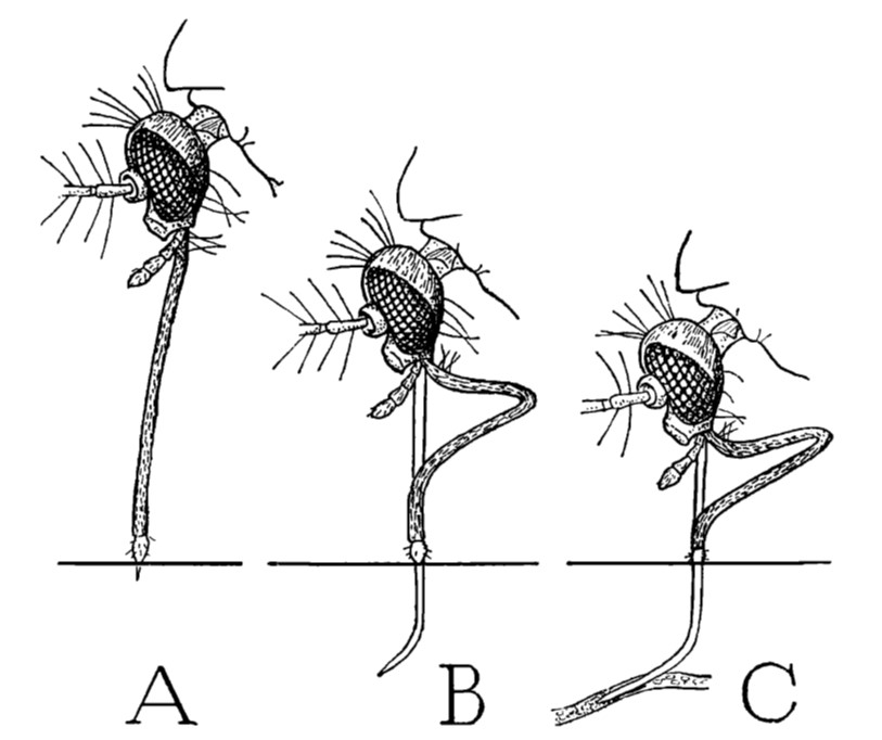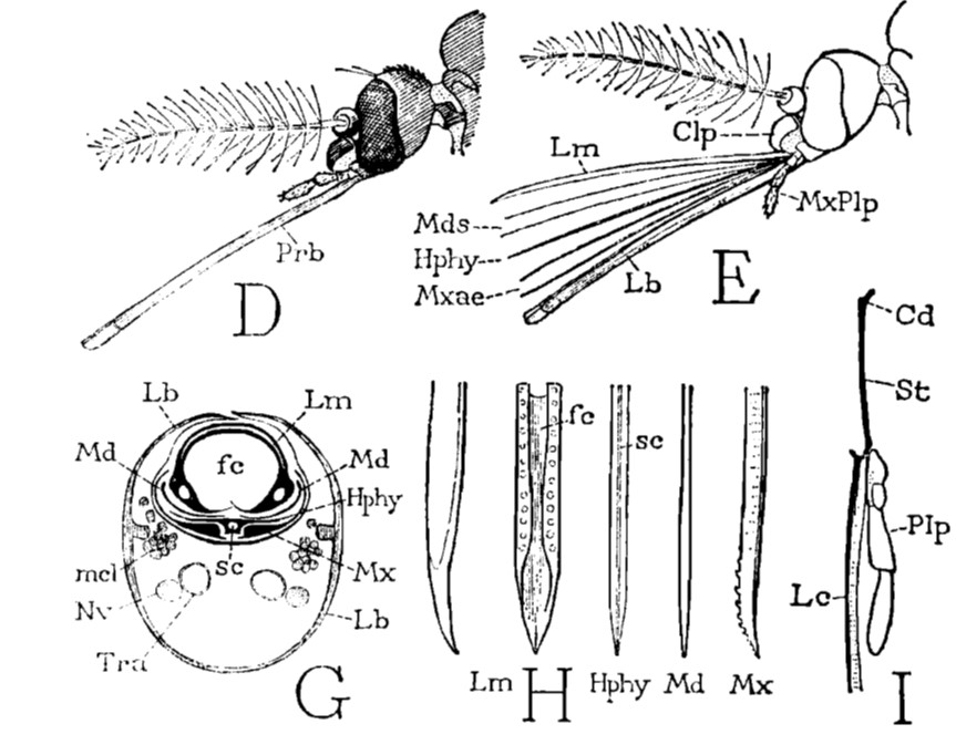Anyone who has taken a few moments to observe a mosquito as it prepares to take a blood meal from their arm has noticed they have a long needle-like structure emanating from their head. This is known as its proboscis. What most don’t realize is that the entire structure is not inserted under the skin. What you are looking at is a sheath which encloses and protects the stylets which make up the feeding tube that is inserted under the skin. This sheath known as the labium (Fig. 2, E and G, Lb) is normally a flattened “lower lip” in most insects, but here has been curved around into a tube to enclose the stylets. This labium must be folded out of the way when the mosquito takes its blood meal (Fig. 1).